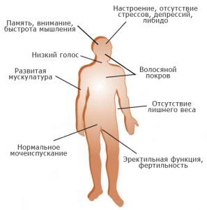 Роль тестостерона в организме заключается в определении половой принадлежности, инициации пубертатного периода, формировании мужского и женского типов поведения. От его уровня зависят степень сексуального влечения, настроение, мыслительные процессы. Содержание гормона в крови сказывается на жировом, углеводном и минеральном обмене. На периферии из него образуются эстрадиол и более сильный андроген — дигидротестостерон.
